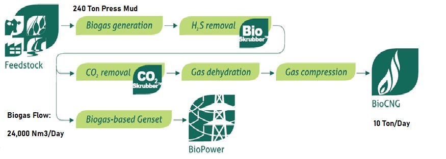 The project consists of Biogas Generation from organic material such as Press Mud and biogas cleaning for producing BioCNG.